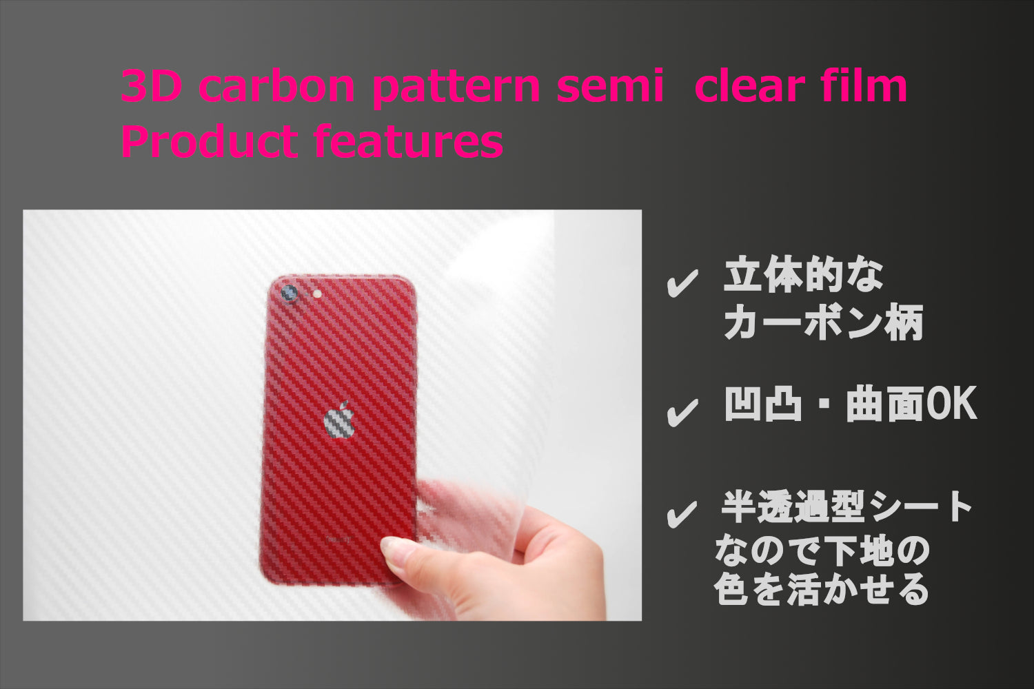 ▼耐久性・耐熱性・伸縮性・・・PVCは合成樹脂なので、材質的に耐久性や耐熱性があります。耐久性は一般的な化学薬品に対して耐性(酸性やアルカリ性に対して)があるという意味になります。有機溶剤に対しては溶解する可能性があるため使用は控えてください。 ▼ 光沢・構造について・・・この商品は、半透明のホワイトベースのシートに3D柄を刻印した2層構造(本体と剥離フィルム)のシートです。マット調セミクリアのため、光沢はありませんが、下地の色を透過しますので、貼付対象物の色あいが活かせるシートになります。透過型シートなので3Dカーボン柄をした保護フィルム・プロテクションフィルムとも言えます。 ▼加工性・・・多少の折り目がついてもヒートガンで熱しながら施工すれば曲面もスムーズに貼れます。また、施工中にエアを噛んでしまった場合、ヒートガンなどで温めながら剥がせば、再度施工可能です。施工中、エア抜きでシワになる可能性もありますのでゴリゴリとはせず、ゆっくり作業をしてください。